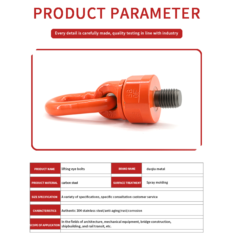 - Kusamalira: Muziyeretsa nthawi zonse ndikuyang'ana bolt yokweza maso. Patsani mafuta ulusi nthawi ndi nthawi kuti zisawononge dzimbiri ndikuwonetsetsa kuti zichotsedwa bwino ndikuziyikanso ngati pakufunika. Ngati kuwonongeka kulikonse kuzindikirika, chotsani bolt yamaso nthawi yomweyo ndikuyikanso.